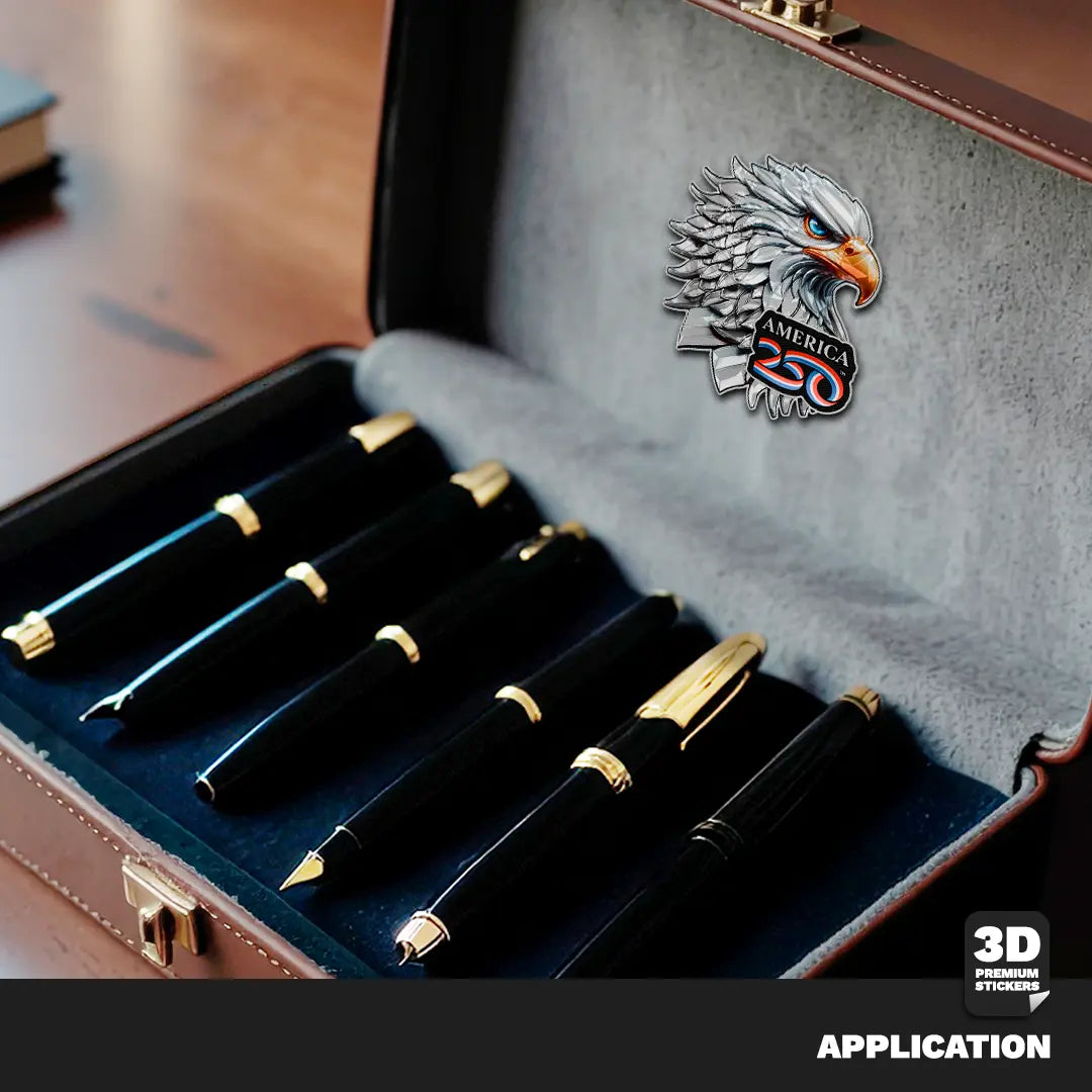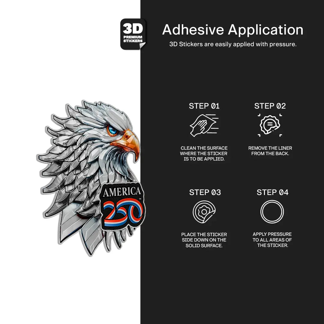 Celebrate 250 years of the United States with a design that embodies strength and heritage. This premium 3D sticker features a bold eagle graphic paired with the America 250 emblem, crafted to stand out wherever you place it.