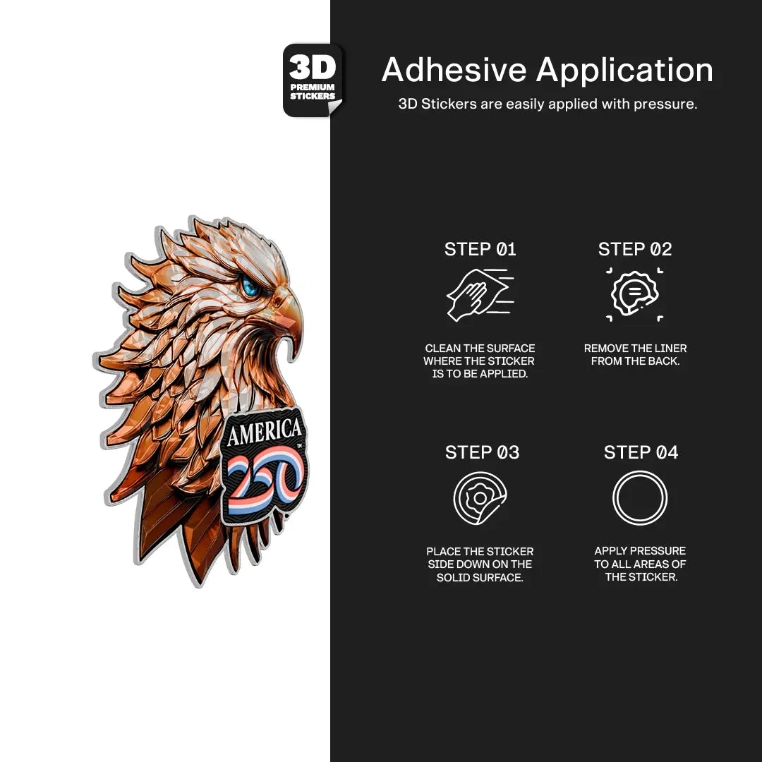 Celebrate 250 years of the United States with a design that symbolizes strength and heritage. This premium 3D sticker features a striking copper-toned eagle paired with the America 250 emblem, crafted for those who want to make a bold statement.